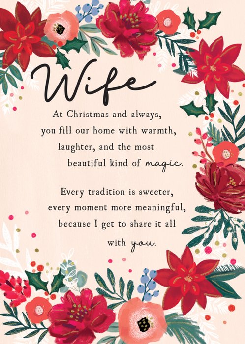 "Wife. At Christmas and always, you fill our home with warmth, laughter, and the most beautiful kind of magic. Every tradition is sweeter, every moment more meaningful, because I get to share it all with you."