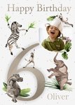 Cute illustrated photo upload card with large number 6 surrounded by watercolour illustrated dancing animals