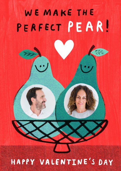 Featuring two smiling illustrated pears sitting in a basket with two circular photo upload frames inside the pears, a white heart above them, and bold hand-lettered text, on a bright red background.