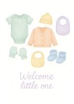 Illustrated greeting card featuring neatly arranged pastel baby clothes and accessories, including a onesie, cardigan, hat, bibs, mittens, and booties, centred on a clean white background.