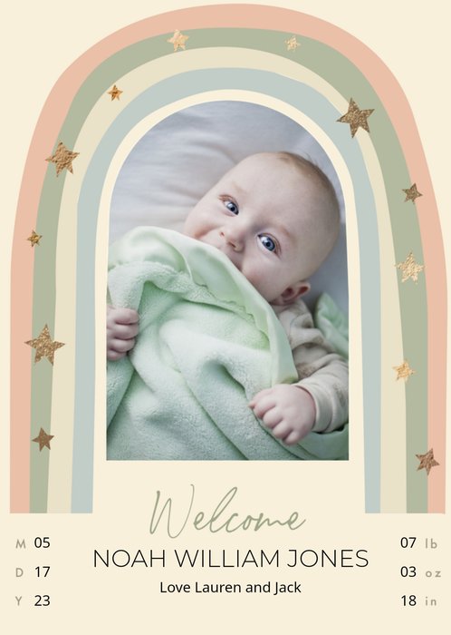 Front of card: Featuring a heart shaped photo frame with handwritten typography on a brown textured background. Text reads: "Welcome little one Zachary Jayden Norton 07-04-23". 'Zachary Jayden Norton 07-04-23' can be personalised!