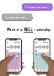 Front of card: Featuring an illustration of a pair of smart phones with a Reels app feature. Text reads: "You send me reels... I send you reels we're in a reel-ationship".