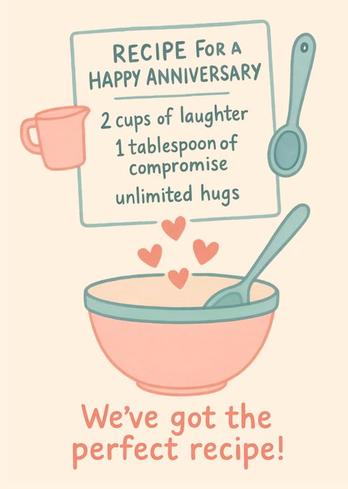 "Recipe for a happy anniversary. 2 cups of laughter. 1 tablespoon of compromise. Unlimited hugs. We’ve got the perfect recipe!"