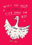 Featuring a hand-drawn white goose with wings outstretched and an orange beak and feet, with playful handwritten text and small heart doodles, on a bright pink background.