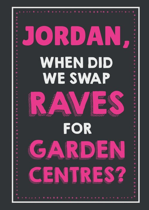 Front of card: Featuring bold pink typography on a black background. Text reads: "Jordan, when did we swap raves for garden centres?” 'Jordan,' can be personalised!