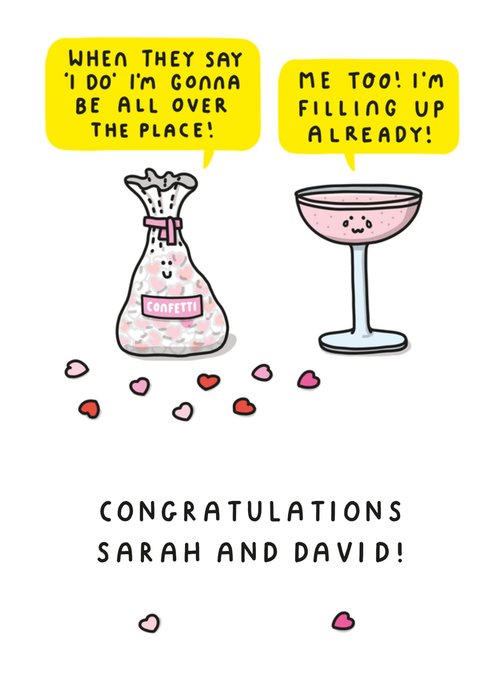 Front of card: Featuring a funny illustration of a confetti bag and a wine glass character. Text reads: "When they say I do I'm going to be all over the place! Me too I'm filling up already! Congratulations Sarah and David!". 'Sarah and David' can be personalised!