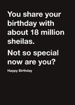 Front of card: Humorous Birthday Card White typography on a black background. Text reads: "You share your birthday with 18 million sheilas. Not so special now are you? Happy birthday".