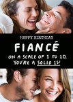 Front of card: Fiancé's Photo Upload Birthday Card White typography on a black panel with two photo frames. Text reads: "Happy birthday fiancé on a scale of 1 to 10, you're a solid 15!". 'To a lovely' can be personallised!