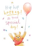 Winnie The Pooh holding a balloon. Text reads: "Hip Hip Hooray It's Your Special Day"