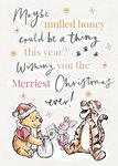 This ‘Winnie the Pooh’ Christmas card design features Pooh, Piglet, and Tigger in festive attire with a humorous holiday message suggesting “mulled honey” and wishing the recipient the “merriest Christmas ever.”
