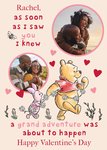 Front of card: Featuring an illustration of Winnie The Pooh and Piglet with two circular photo frames. Text reads: "Rachel, as soon as I saw you I knew a grand adventure was about to happen happy Valentine’s Day". 'Rachel' and 'happy Valentine’s Day' can be personalised!