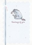 Front of card: Featuring Eeyore holding a flower surrounded by scattered stars. The illustration sits within a pale blue scalloped frame and is edged with lilac ribbon and a cream border.