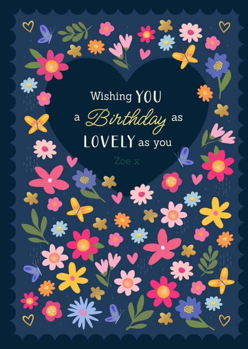 Featuring colourful flowers, butterflies, and hearts arranged around a large heart shape, with text in the middle. on a blue background, with a navy scalloped border.