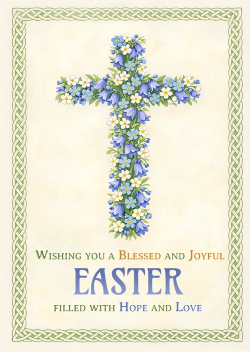Featuring a blue and white floral cross centred inside a green Celtic knot border on a greeting card, set on a warm cream background with large text at the bottom.