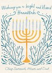 Front of card: Featuring an illustration of a Hanukkah candle. Text reads: "Wishing you a bright and blessed Hanukkah Chag Sameach, Mum and Dad". 'Chag Sameach, Mum and Dad' can be personalised!
