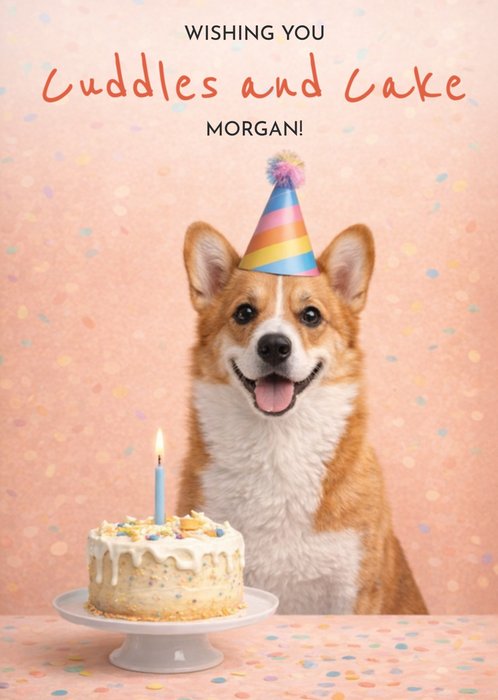 Featuring a smiling Corgi wearing a striped party hat, behind a birthday cake with a single candle on a peach background scattered with confetti.