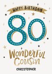 Front of card: Featuring vibrant typography on a cream background. Text reads: "Happy birthday 80 wonderful cousin Christopher". 'Christopher' can be personalised!
