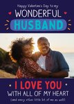 This Valentine's Day card design features the message "Happy Valentine's Day to my wonderful Husband" at the top in white and teal text against a dark purple background. Below this is a rectangular photo upload area in the centre, framed by the purple background, where a scenic outdoor picture can be inserted. The bottom of the card reads "I love you with all of my heart (and every other little bit of me as well!)" in bold red and white text.