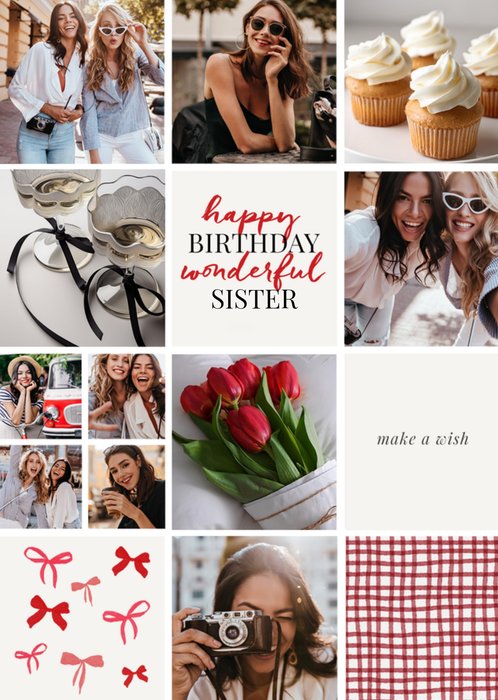 Front of card: Features a grid format of 15 squares. Each square features a mix of images, red themed illustrations and typography. There are 8 photo upload frames.