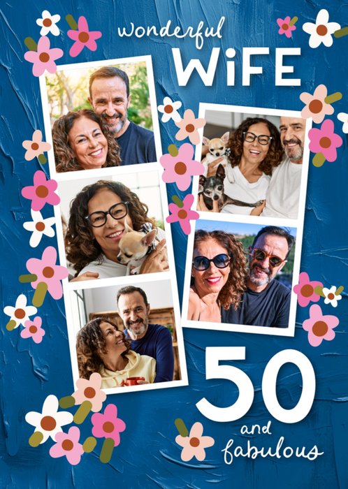Blue painted-style background with floral illustrations around five photo upload frames. Bold white text celebrates a milestone 50th birthday for a wife.