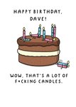 Front of card: Featuring a funny illustration of a cake with loads of candles fornicating on top. Text reads: "Happy birthday, Dave! Wow that's a lot of f*cking candles.". 'Dave' can be personalised!