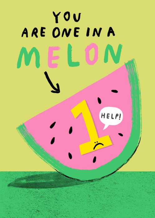 A playful and humorous card featuring a cute watermelon illustration with a wobbly number "1" inside, calling for help. With a quirky and light-hearted design, this card is perfect for making someone smile on any special occasion.