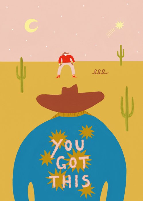 Featuring a bold and motivational vibrant illustration of a cowboy wearing a blue jacket decorated with the encouraging phrase "You got this" standing off against another cowboy, all on a western, desert-themed background.