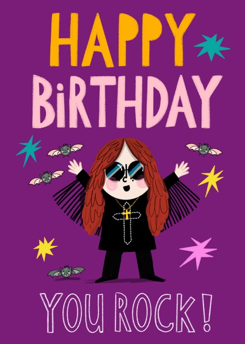 A bright purple birthday card featuring a cartoon gothic rockstar in black with long red hair, sunglasses and a gold cross necklace. Surrounded by colourful starbursts and cartoon bats, the energetic design uses bold and playful fonts to celebrate with rockstar flair.