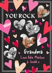 Front of card: Featuring five heart shaped photo frames surrounded by hearts on a black background. Text reads: "You rock Grandma love Adie, Marlow