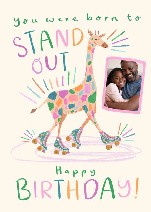 Featuring a colourful spotted giraffe on roller skates surrounded by hand-written text, with one rectangular photo frame on a cream background.