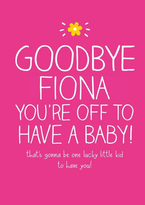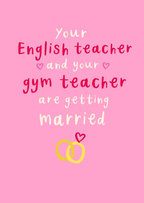 A playful and quirky wedding card featuring bold hand-lettered text in red, cream, and pink against a bright pink background. With interlocked wedding rings and heart doodles.