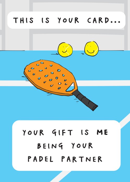 Illustration of two smiling tennis balls and an orange padel racket resting on a court, with playful, casual messaging suggesting a padel partnership as the gift.