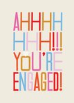 Front of card: A fun, typographic design featuring bold multicoloured hand-lettering with an engagement ring icon inside the letter O, on a warm cream background.