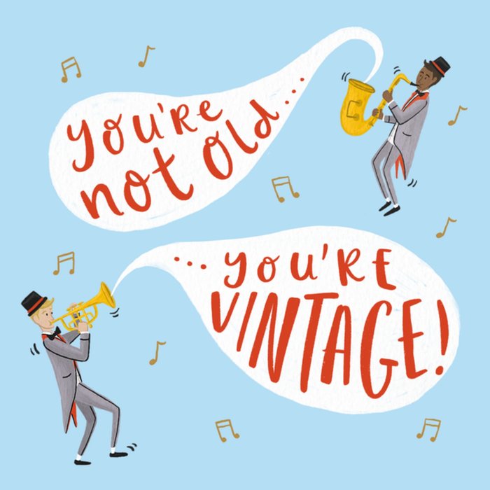 A playful design featuring two illustrated musicians playing a trumpet and a saxophone with musical notes and speech bubbles on a light blue background.