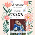 Front of card: Featuring a photo frame adorned with watercolour flower illustrations. Text reads: "A mother like no other you've been just like a mum to me happy birthday".