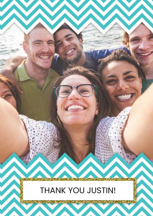 Featuring one photo area framed by a teal chevron pattern with a gold glitter-effect text panel on a white background.