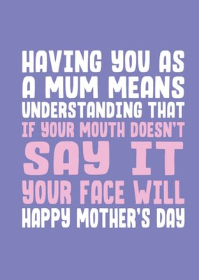 Humourous White And Pink Typography On A Purple Background Mother's Day Card