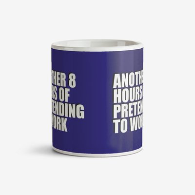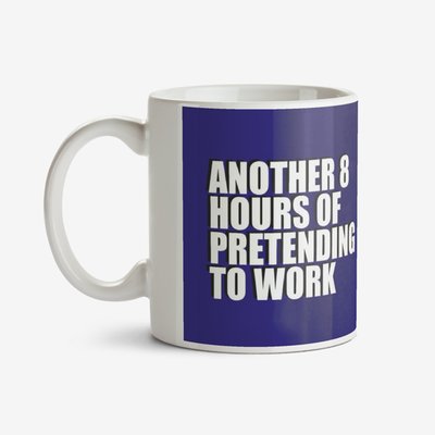 Blue typographic mug with a caption that reads Another 8 Hours Of Pretending To Work