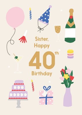 Illustrated Cute Party Balloons Sister Happy 40th Birthday Card