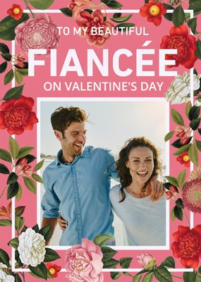 Bright Coral & Floral Border To My Fiancee Valentine's Day Photo Card