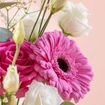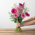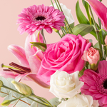 Brimming with fresh pink blooms, from vibrant gerberas to graceful lilies and classic roses, this bouquet brings a sense of joy and gentle elegance. The soft eucalyptus and white accents add a calming touch - perfect for thoughtful moments, big or small.