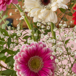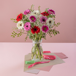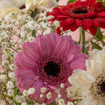 Bright, bold, and full of feel-good vibes – this cheerful bunch is like a hug in flower form. With a mix of joyful gerberas in red, pink and creamy white, it’s perfect for birthdays, thank yous or just because.