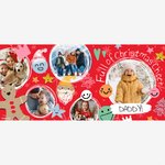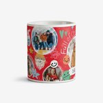 Featuring 5 photo upload frames & playful Christmas doodle illustrations including smiley faces, stars, trees, a gingerbread figure and a Santa hat & beard, with bold typographic details, all on a red coloured background.br>