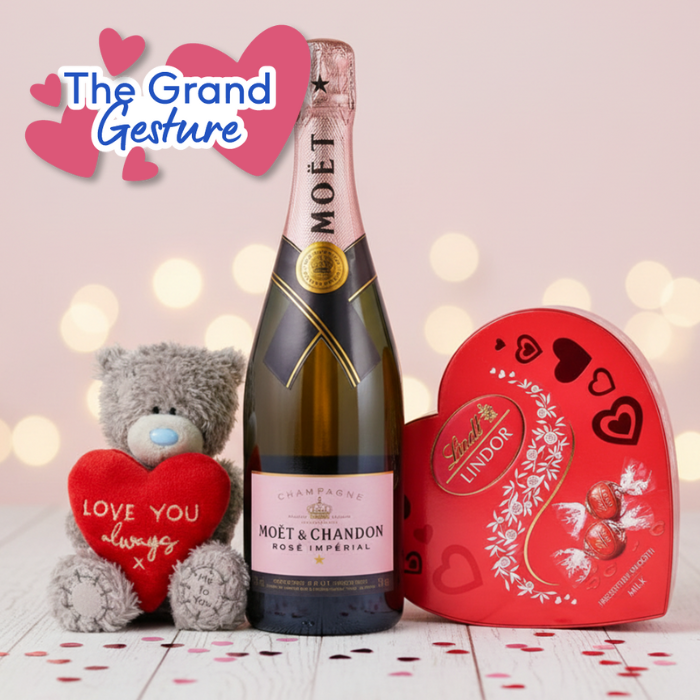 The ultimate romantic gesture - pink Moët champagne, Lindt heart chocolates and a cuddly Tatty Teddy. It’s romantic, luxurious, and made to wow.