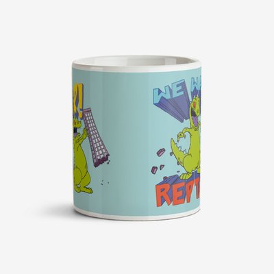 Blue typographic mug with two white boxes that have the caption You're My Cup Of Tea in them