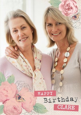 Pink Roses And Butterflies Personalised Photo Upload Happy Birthday Card For Mum