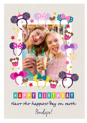 Mickey And Minnie Mouse Ears And Treats Photo Upload Birthday Card