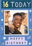 A large photo frame is surrounded by text, stars and streamers on a blue background. Big, bold text at the top of the card says '16 today', the age is editable.