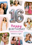 A pink background design featuring a large silver disco-ball style “16” surrounded by eight photo upload frames.
