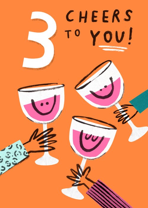 A colourful design featuring three illustrated glasses being clinked together, with hand-written text above, on an orange background